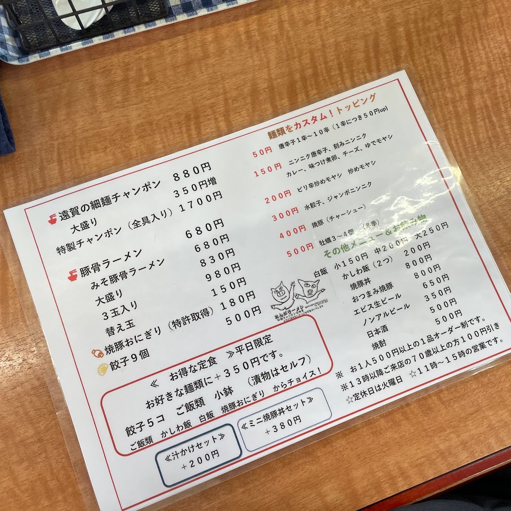 ※店内でご注文する事ができるメニューです。【ちゃんぽん】・遠賀の細麺ちゃんぽん 880 円 (大盛り +350 円)・特製ちゃんぽん(全具入り) 1700 円【豚骨ラーメン】・豚骨ラーメン 680 円・みそ豚骨ラーメン...